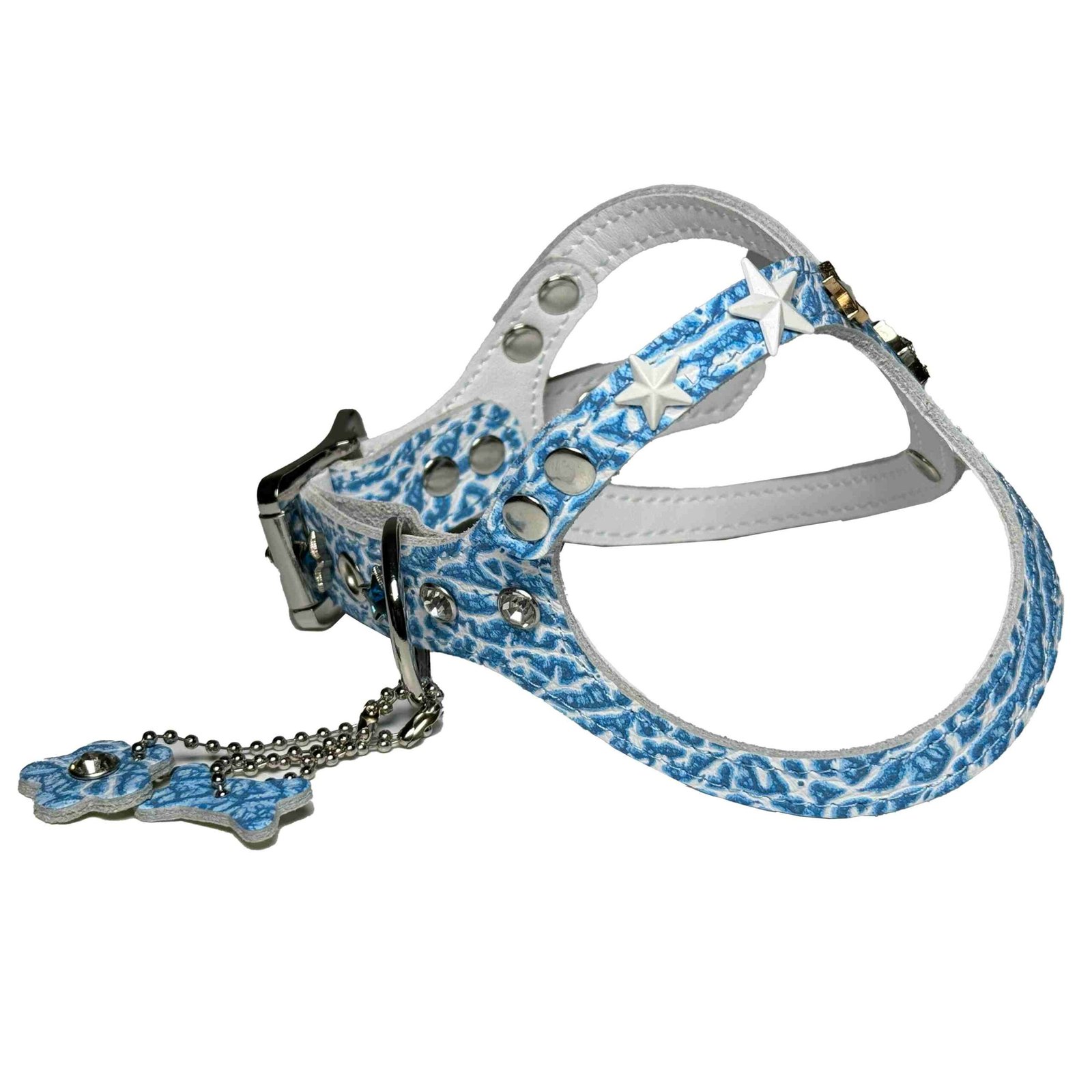 动感豹纹美学: 我们采用显色染色技术,在 全粒面纯牛皮上印上多层次、活力四射的豹纹。图案的深浅随光变化,宛如鲜活的丛林图案,让您的爱犬的每天每时每刻都穿着原始神秘的渊源。